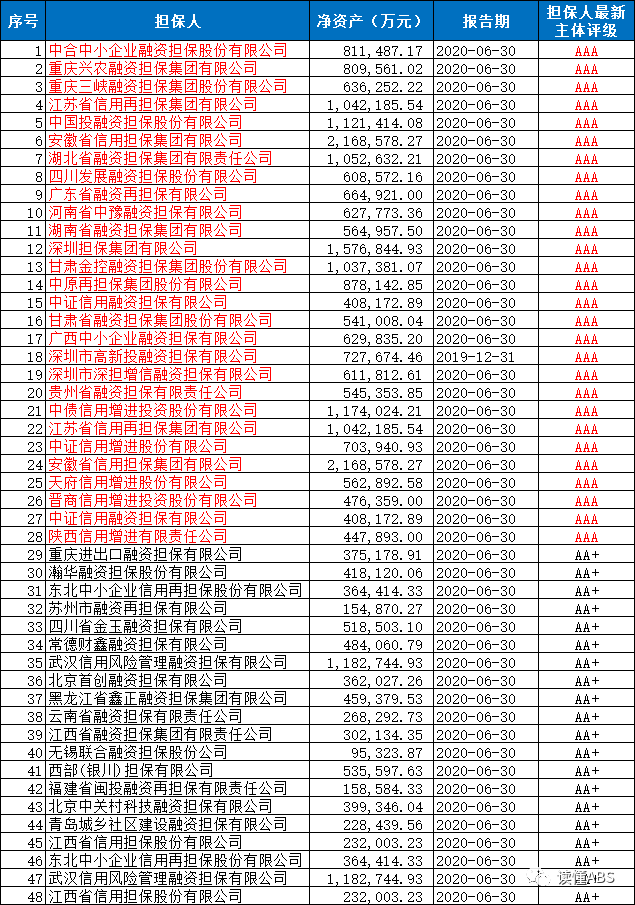 從目前已獲批的充當申請人和擔保人的擔保公司來看,評級均達到AAA,截止目前,債券市場活躍的3A評級的擔保公司有哪些呢?讀懂ABS根據企業預警通App導出的數據如下: