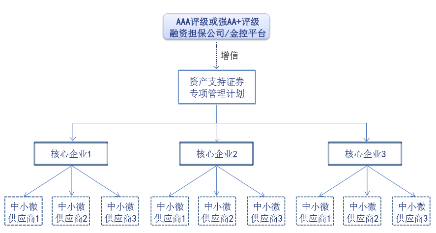 “1+N+N”模式(其中:“1”是指金控平臺/擔保公司牽頭發起的資產管理計劃,“N”是指具有延長應付賬款需求的N戶核心企業,“N”是指供應鏈中的N個中小微企業)是以中小微企業與核心企業的真實交易為基礎,將中小微企業對核心企業的應收賬款作為基礎資產打包成資產管理計劃進行證券化發行。金控平臺/擔保公司發揮自身主體評級優勢,為核心企業的應付賬款提供增信支持,提高項目的信用評級和發行成功率。
