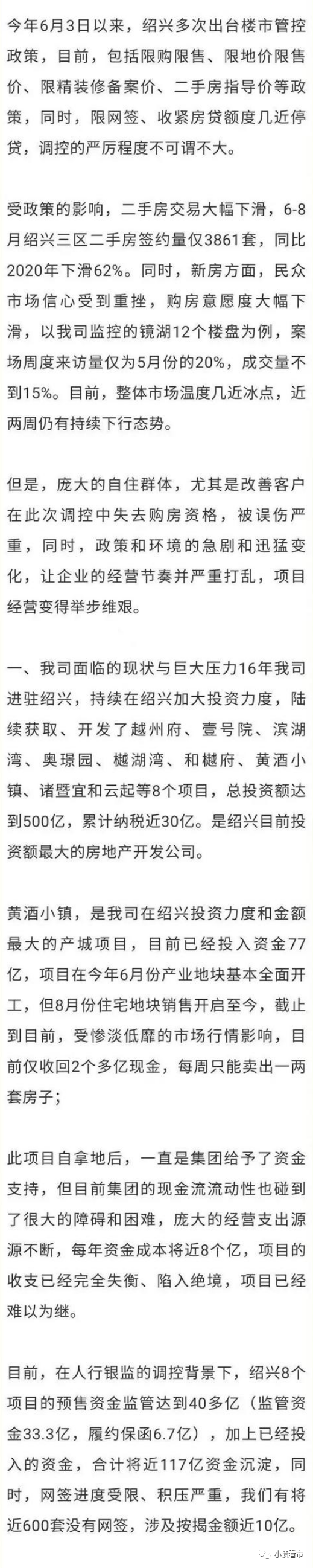信中稱,因限購限售、房貸額度收緊等調(diào)控政策,融創(chuàng)中國(01918.HK)在浙江紹興的項(xiàng)目銷售慘淡,網(wǎng)簽進(jìn)度和按揭回款受限,公司懇請紹興市政府給予政策上的專項(xiàng)支持。