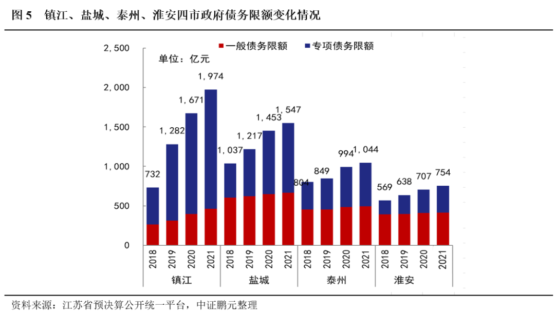 鎮江市政府債務限額及再融資債券增長規模均優于省內其他弱區域,佐證了省級層面化債支持。從政府債務限額角度來看,2018年-2021年,鎮江市政府債務限額從732億元大幅提升至1,974億元,增幅遠超其他蘇北地區債務較重區域(鹽城、泰州、淮安)。期間,2019年及2020年,鎮江市本級發行再融資債券15.70億元和85.49億元用于置換存量債務。政府債務限額的提升及再融資債券發行規模的增長,佐證了政府化債舉措,亦反映了省政府對鎮江市化債的支持。
