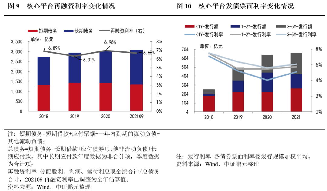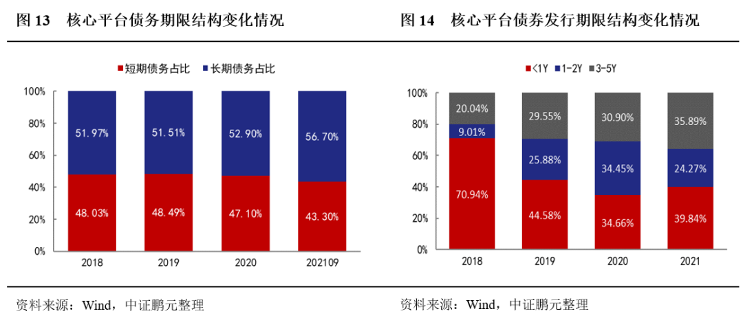 鎮江市核心平臺債券發行期限結構近年整體改善明顯。從平臺債務期限結構來看,2018年-2020年,鎮江五大市級平臺短期債務占比小幅波動,2021年1-9月,核心平臺短期債務占比顯著下降,債務期限結構有所改善。從債券發行視角來看,核心平臺中長期債券發行比例呈現持續增長態勢,債券發行期限結構改善明顯。