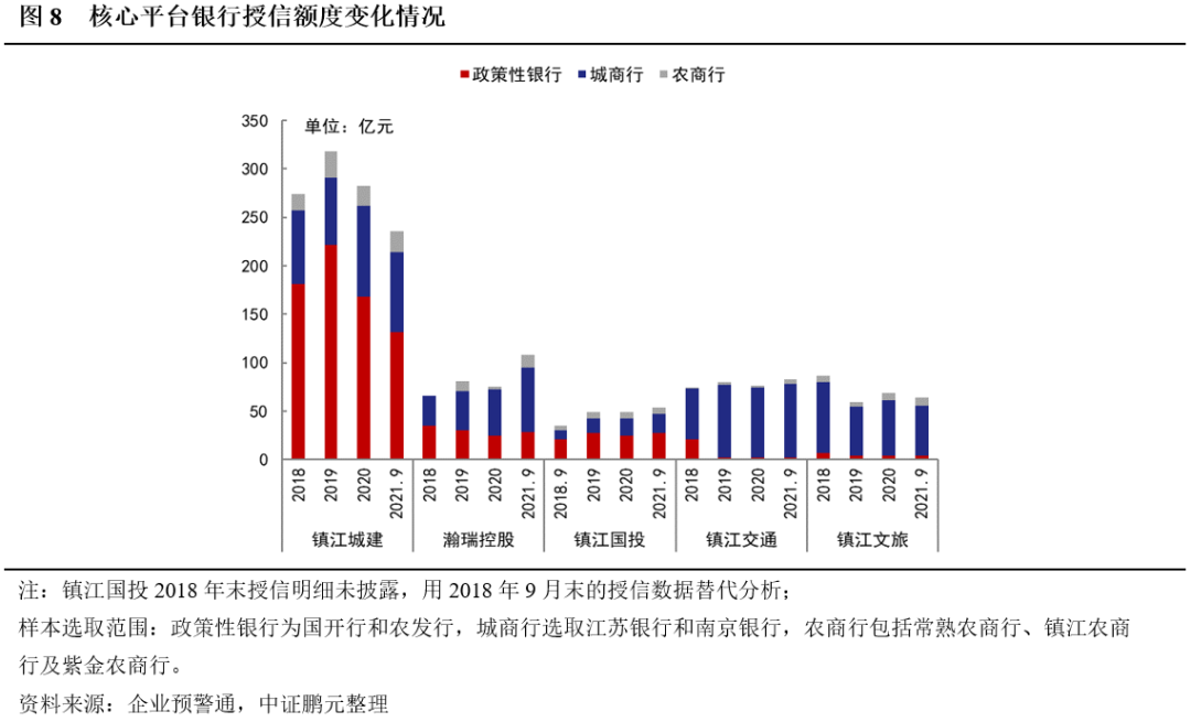 省內城農商行對五大核心平臺融資支持力度較大,授信規模增加明顯。由于鎮江尋求國開行進行隱性債務置換的方案未最終落地,政策性銀行對鎮江城投平臺的融資支持力度較弱且缺乏普遍性。2018年到2019年期間,僅鎮江城建一家平臺獲國開行大幅提額,且2020年起五大平臺在政策性銀行的授信額度遭遇整體壓降。而城農商行貸款主要集中于江蘇省內,與地方政府關系密切,在化解隱債的過程中更有可能成為政府協調金融資源的主要渠道。江蘇省內共有4家城商行和56家農商行,截至2020年末,總資產規模合計72,465.30億元,其中江蘇銀行及南京銀行總資產規模均超萬億元,可協調的金融資源較為豐富。2018年-2021年9月期間,省內城農商行對五大平臺的授信額度整體增加了79.54億元,融資支持力度更大且更具有普遍性和持續性。