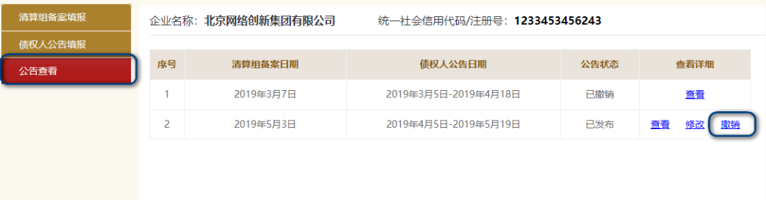 3.1進入“公告查看”頁面,點擊要撤銷的備案記錄后的“撤銷”