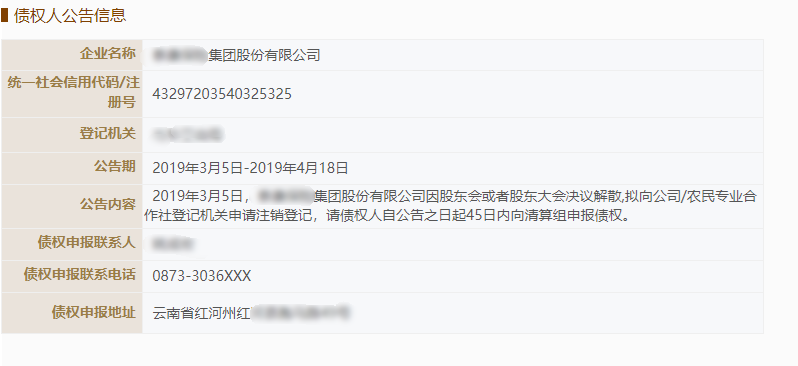 5.2在企業信息頁面,標注“正在進行債權人公告,公告期:XX年X 月X日- XX年X 月X日”