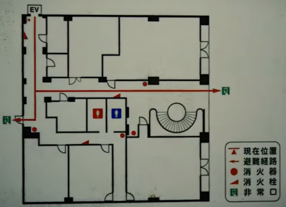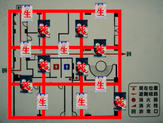 其一,密室的整體路線及配套提示設(shè)計。以知名的日本漫改、奈飛影視作品《彌留之國的愛麗絲》第一關(guān)的密室逃殺為例,整個密室以消防通道線路圖為藍(lán)本,以九宮格的形式構(gòu)建了每一處小密室的“生門”、“死門”在打開后對應(yīng)的劇情后果,并通過長度、轉(zhuǎn)角、消防圖例設(shè)施設(shè)備、NPC提示等給予玩家推測依據(jù),從而破解該密室的正確開門選項和逃脫路徑。
