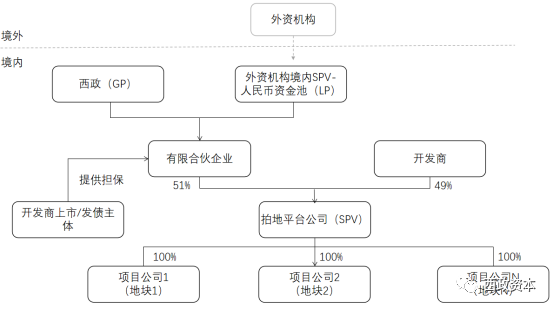 1. 西政(GP)與外資機構境內SPV(LP)共同設立有限合伙企業,有限合伙企業與開發商共同出資設立拍地平臺公司,平臺公司承載土地保證金的資金池。