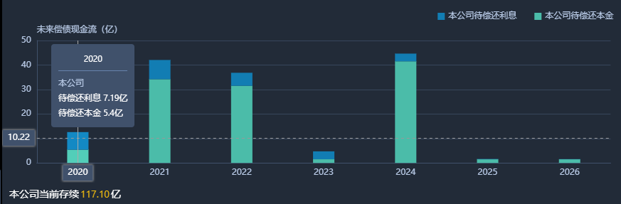 2020年,九華的償債壓力遠低于往年。今年剩余待償還本金及利息總計約12.59億元,當前存續債券本息共計117.1億,零散分布在未來7年內,其中2021年及2024年償債壓力最大,均逾40億元。