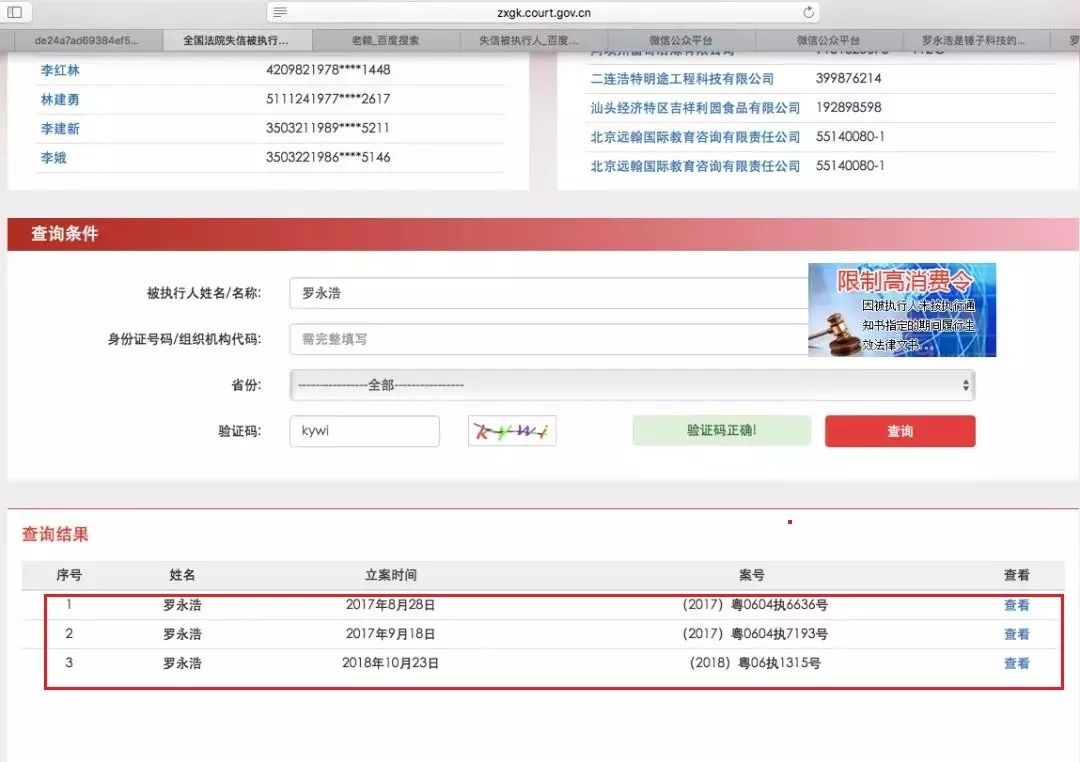 三條信息的案號與上文的1977年生的羅永浩為同一人。