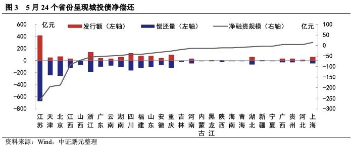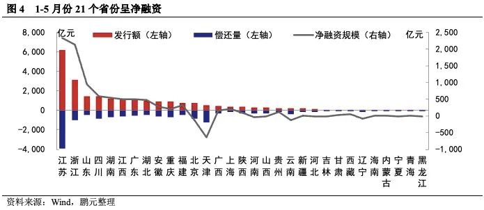24個省份城投呈現凈償還,以江蘇、天津、北京的凈償還規模較大。5月份,城投債發行規模較為集中的省份與前期變化不大,江蘇、浙江、四川等省份繼續領跑全國。發行規模驟減導致5月份共有24個省份呈城投債凈償,江蘇、浙江和北京分別以凈償還255.65億元、194.50億元、187億元位于前三位;5月份,實現凈融資的省份僅4個,且凈融資規模均較小。