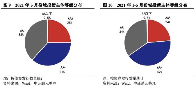 5月份高級別主體發債占比近6成,主體評級中樞下移。5月份,發行主體在AA+級及以上的城投債占比合計為61.8%,較上月減少1.5個百分點,主體信用級別中樞下移。綜合1-5月份情況來看,發行主體在AA+級(含)以上等級的城投債合計占比65%,較1-4月份中樞下移,但與2020年主體級別中樞基本持平。