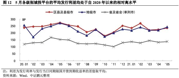 從各級別城投平臺平均發行利差來看,5月份各行政級別平臺發行利差環比均走闊。區縣及縣級市平臺、地級市平臺、省及省會(單列市)平臺的發行利差分別較上月擴大11BP、23BP、4BP。同時,可以觀測到各級別城投平臺的平均發行利差均處于自2020年以來的相對高水平,表現出市場對當前新發城投債偏謹慎,城投發行成本上升。