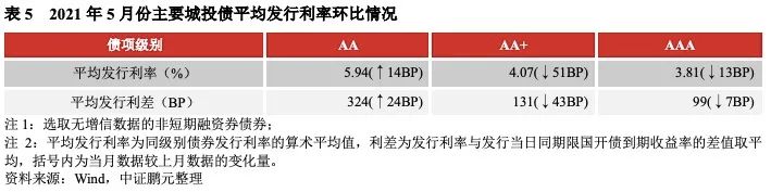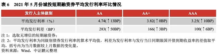 2021年5月份,無增信城投債的最高發行利率為7.50%,較上月下行50BP;最低發行利率為2.29%,較上月下行11BP,利率區間收窄。分級別來看,無增信AA級、AA+級、AAA級城投債的平均發行利率較4月份分別上行14BP,下行51BP、下行13BP,發行利差分別擴大24BP、收窄43BP、收窄7BP。城投短期融資券品種(含超短融)的發行利率全線上行,利差呈現擴大趨勢。