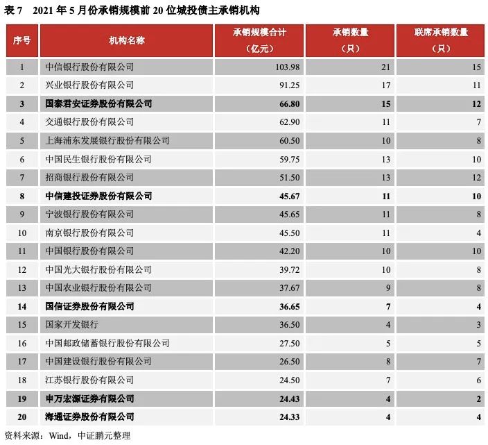 2021年5月,共有73家機構參與了城投債的承銷工作,發行下降致城投承銷商較上月減少28家。總體來看,銀行類機構的總體排名較為領先。就承銷規模而言,中信銀行以103.98億元的承銷規模位居第一,連續5個月蟬聯榜首;興業銀行以91.25億元的承銷規模位居第二。承銷規模前二十位的機構中,券商類機構共有5家,較4月份減少1家。除國泰君安排名券商第一位,總排名第三位以外,中信建投、國信證券、申萬宏源和海通證券分別位列第8、14、19、20位。