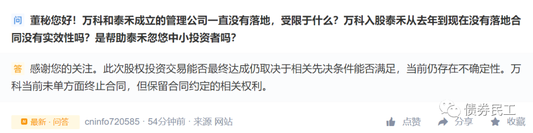 2、2021年6月1日,萬(wàn)科董秘在深交所互動(dòng)平臺(tái)中明確表示,萬(wàn)科和泰禾的合作事宜最終能否達(dá)成取決于相關(guān)先決條件能否滿足,目前仍然存在不確定性。在2020年7月31日,深陷違約泥潭的泰禾集團(tuán)公布了重磅消息:萬(wàn)科正式入股泰禾集團(tuán),將持有泰禾集團(tuán)19.9%股份。當(dāng)時(shí)這筆交易存在明確的先決條件泰禾制定債務(wù)重組方案并與債權(quán)人達(dá)成一致、萬(wàn)科對(duì)泰禾完成盡調(diào)且就發(fā)現(xiàn)問(wèn)題的解決方案及擬議交易的方案達(dá)成一致。