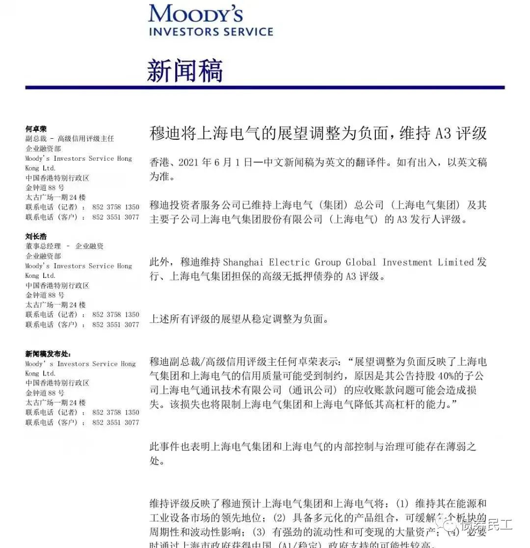 3、2021年6月1日,穆迪將上海電氣(集團(tuán))總公司及其核心子公司上海電氣集團(tuán)股份有限公司的評(píng)級(jí)的展望從“穩(wěn)定”調(diào)整為“負(fù)面”。在上海電氣集團(tuán)股份有限公司5月31日的公告中,公司持股40%的控股子公司上海電氣通訊技術(shù)有限公司應(yīng)收賬款普遍逾期,最終可能對(duì)公司造成83億元的損失。此次應(yīng)收賬款逾期事件在市場(chǎng)上引起了較大的關(guān)注,后續(xù)進(jìn)展和信息披露尤其引人注意。