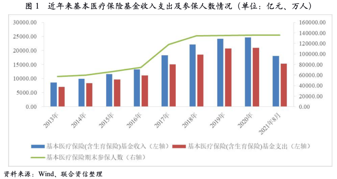 從醫(yī)藥行業(yè)下游支付能力來看,醫(yī)保基金作為最重要的支付方,其支付額約占整體醫(yī)療衛(wèi)生總費(fèi)用的約40%,醫(yī)保基金的支付能力直接決定了醫(yī)藥行業(yè)的回款情況。根據(jù)國(guó)家醫(yī)保局?jǐn)?shù)據(jù)顯示,2020年,全國(guó)基本醫(yī)保基金(含生育保險(xiǎn))總收入為2.46萬億元,同比增長(zhǎng)0.08%;全國(guó)基本醫(yī)保基金(含生育保險(xiǎn))總支出為2.09萬億元,同比變化不大,年末醫(yī)保基金累計(jì)結(jié)余3.14萬億元。2021年1-10月,全國(guó)基本醫(yī)保基金(含生育保險(xiǎn))總收入為2.46萬億元,全國(guó)基本醫(yī)保基金(含生育保險(xiǎn))總支出為1.90萬億元。
