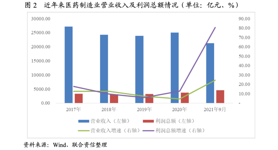 2020年,受新冠肺炎疫情影響,各層級(jí)醫(yī)療機(jī)構(gòu)日常診療活動(dòng)減少,藥品終端銷售市場(chǎng)規(guī)模近年來首次出現(xiàn)負(fù)增長(zhǎng),但隨著人均可支配收入增長(zhǎng)、人口老齡化趨勢(shì)逐年加重以及醫(yī)保收入和參保人數(shù)增加,中國(guó)醫(yī)藥需求仍保持穩(wěn)健。2021年以來,醫(yī)藥行業(yè)盈利水平逐漸從新冠肺炎疫情的影響中恢復(fù),醫(yī)藥制造業(yè)企業(yè)營(yíng)業(yè)收入和利潤(rùn)總額均大幅增長(zhǎng);同時(shí)持續(xù)加強(qiáng)創(chuàng)新研發(fā)投入,行業(yè)內(nèi)企業(yè)獲現(xiàn)能力持續(xù)提升,杠桿水平處于合理水平。
