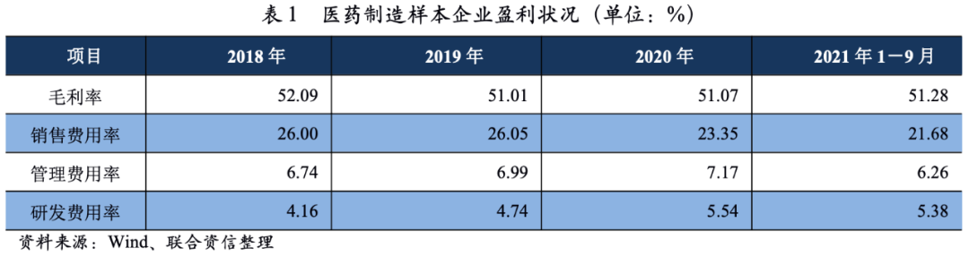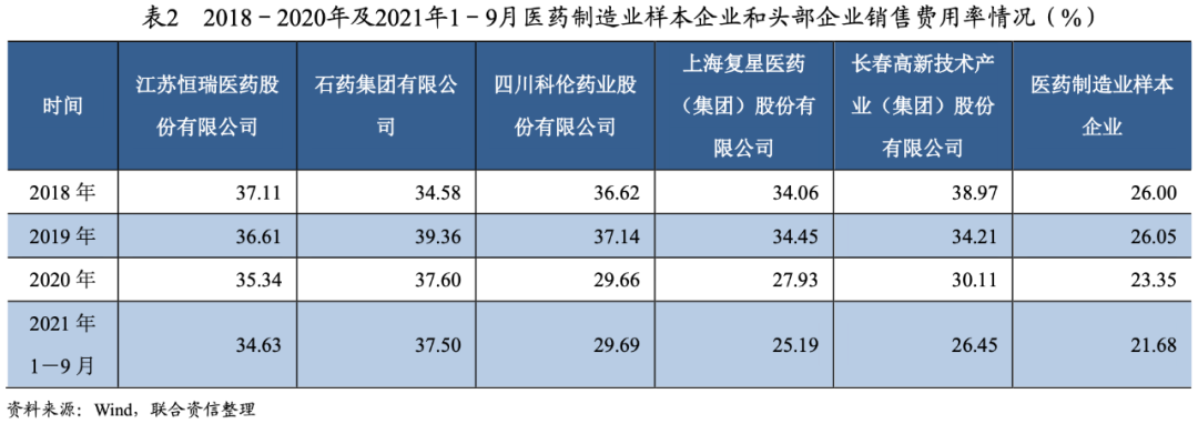 從醫(yī)藥制造業(yè)樣本數(shù)據(jù)分析[2]來看,2018-2020年,醫(yī)藥制造樣本企業(yè)銷售費(fèi)用率分別為26.00%、26.05%和23.35%,波動(dòng)下降,但處于較高水平。2021年1-9月,醫(yī)藥制造樣本企業(yè)銷售費(fèi)用率為21.68%,較上年同期下降1.40個(gè)百分點(diǎn)。2018-2020年,頭部企業(yè)銷售費(fèi)用率均大于27.00%,處于較高水平,對(duì)利潤(rùn)水平存在一定影響。