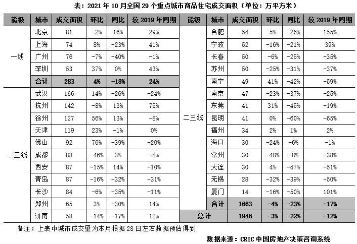 10月,典型城市商品住宅成交熱度延續(xù)低位波動(dòng),基本“見底”,29個(gè)監(jiān)測(cè)城市預(yù)計(jì)成交規(guī)模達(dá)1946萬平方米,環(huán)比微降3%,同比降幅有收窄趨勢(shì),下降22%,較2019年同期降幅為12%。