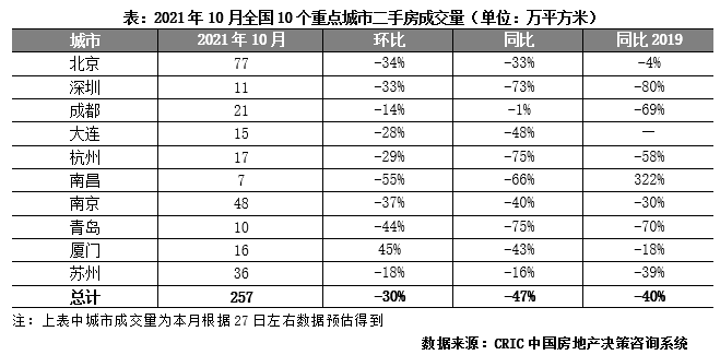 2021年10月,二手房市場(chǎng)整體延續(xù)下行走勢(shì),規(guī)模上環(huán)比再降30%,10個(gè)重點(diǎn)城市共計(jì)成交257萬平方米。較去年同期相比規(guī)模收窄48%,同比2019年跌幅也高達(dá)40%,受困于全國(guó)樓市政策“嚴(yán)苛”,熱點(diǎn)城市調(diào)控力度有增無減,整體市場(chǎng)熱度降溫顯著。