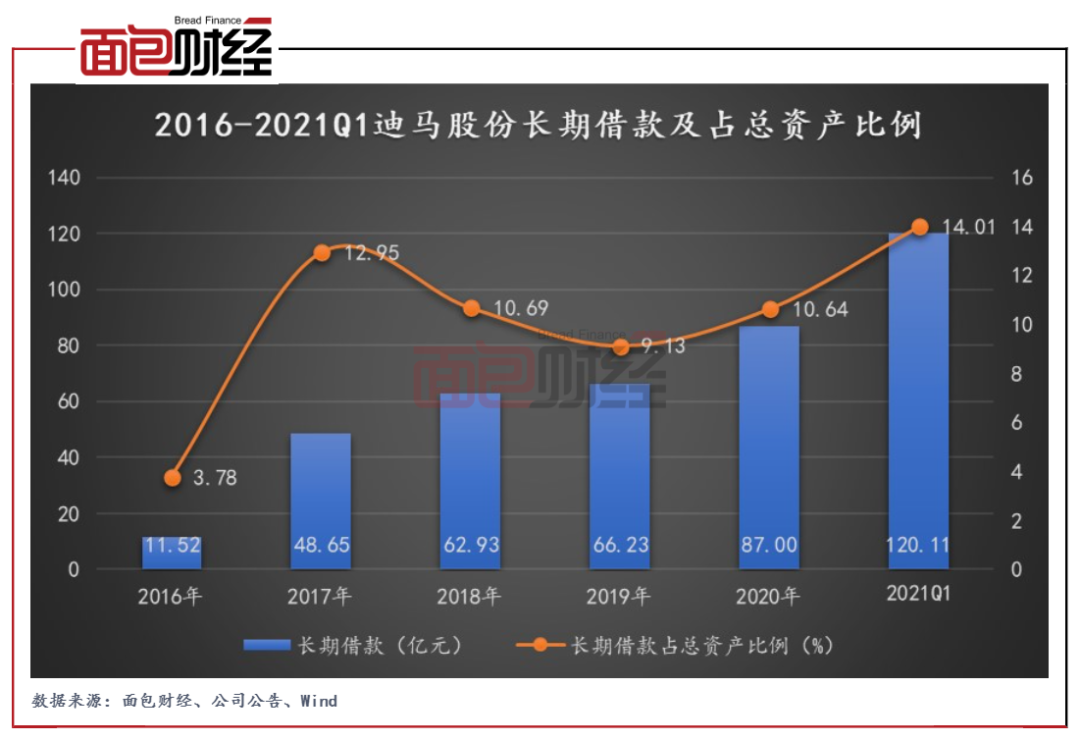 圖2:2016-2021Q1迪馬股份長期借款及占總資產比例