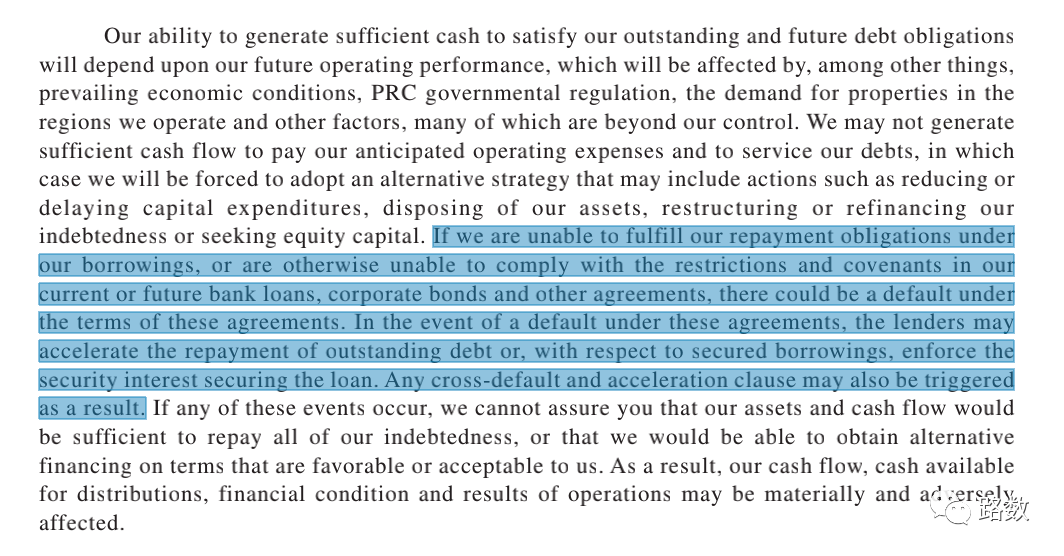 根據(jù)債券募集說明書,當(dāng)中包含了加速清償和交叉違約條款。債務(wù)一旦發(fā)生違約,會觸發(fā)部分公募、銀行、信托借款的交叉違約,需要公司提前進(jìn)行還款,屆時資金鏈壓力巨大。▼