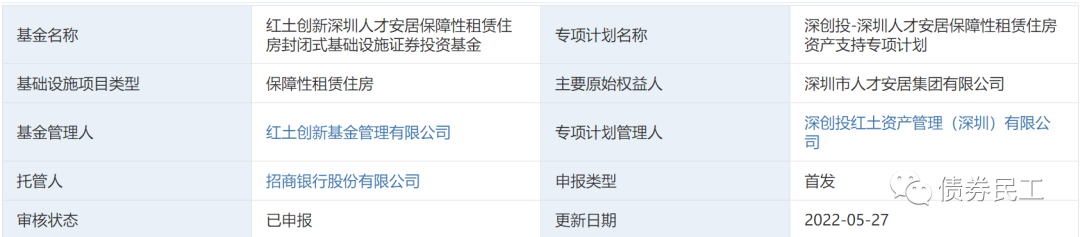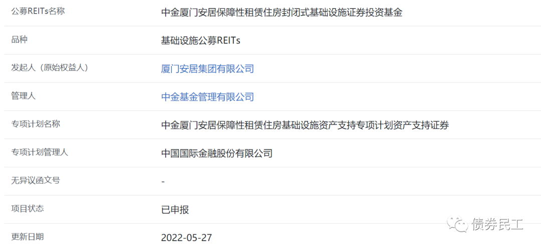 上交所和深交所在2022年5月27日已經分別有一單保障性租賃住房REITs完成了申報,分別為中金廈門安居保障性租賃住房封閉式基礎設施證券投資基金和紅土創新深圳人才安居保障性租賃住房封閉式基礎設施證券投資基金。