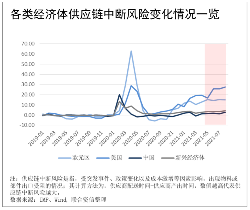 2.大宗商品價格上漲疊加運輸成本不斷走高,令多個經濟體出現部分供應鏈中斷的風險;尤其是2021年5月以來,招工難、原材料短缺以及疫情反復等問題愈發凸顯,令部分供應鏈雪上加霜;美國和歐元區由于其供應鏈全球布局且鏈條較長,部分環節斷裂對其整體供應鏈的運轉造成明顯影響。