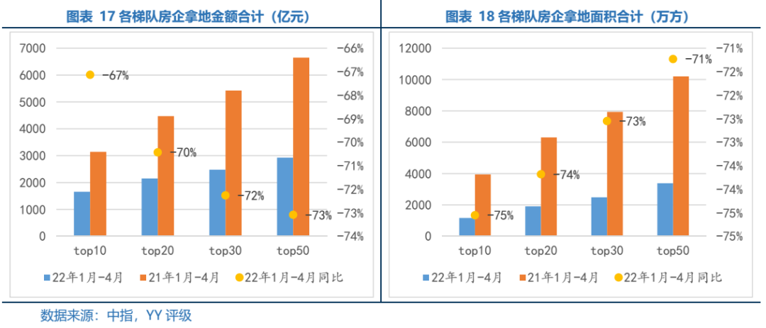 1-4月份行業內各梯隊銷售累計值和門檻值的下跌幅度均較1-3月份繼續加大,行業整體規模收縮的背景下,偏尾部房企可能面臨“無樓可售”的情況,而靠前隊伍中的出險房企則面臨“去化不掉”、“繼續停止拿地”的現象,行業生存環境的惡化并未改變。