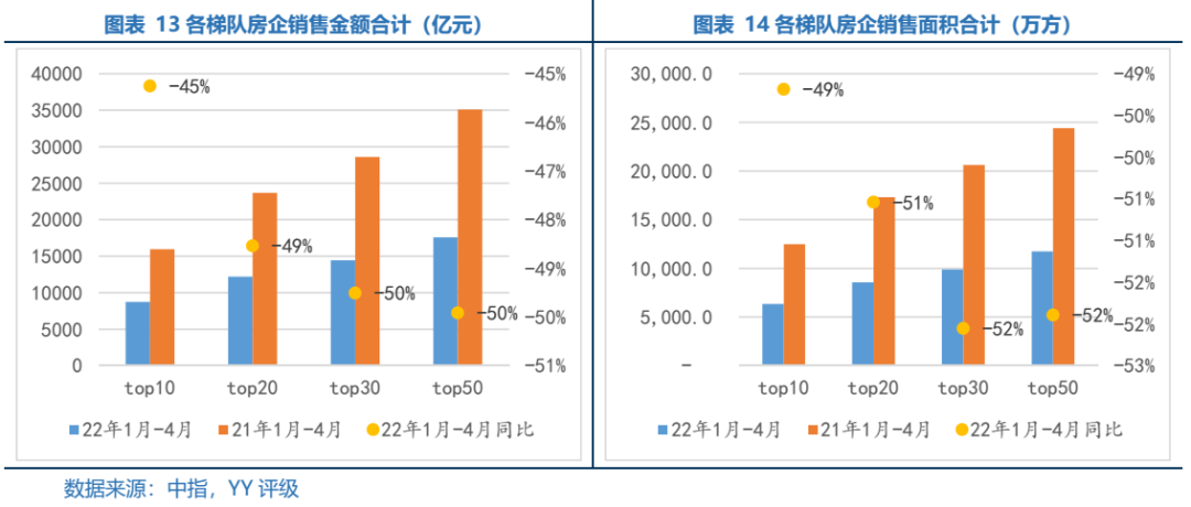 2022年1-4月top10至top50房企的累計銷售金額和售面積同比下跌幅度依次遞增。Top50房企累計銷售金額同比下跌50%,銷售面積同比下跌52%,分別較top10房企下滑百分點增加5.0pct和3.0pct,top50中的偏后段房企銷售下滑更大,在“蛋糕”減少的情況下,行業內部加速割裂,中小規模房企難彎道超車。
