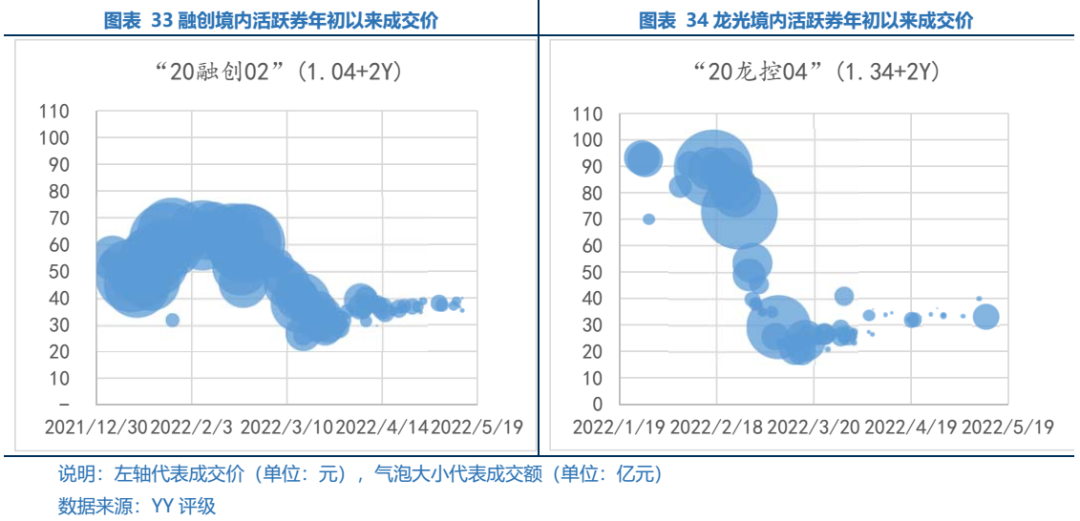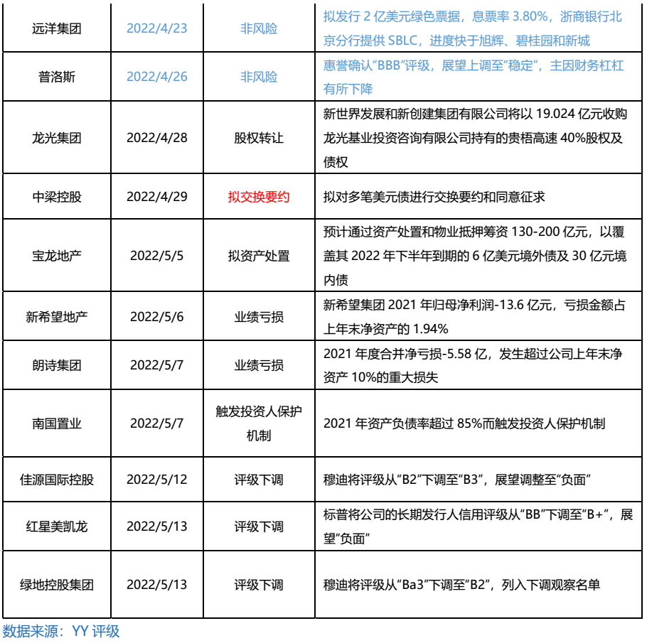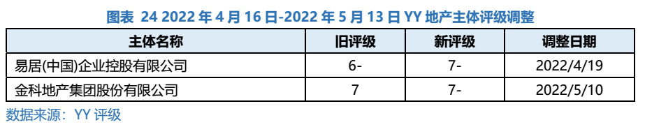 2022年4月16日至5月13日,YY評級綜合評估行業基本面、個體信用資質及負面輿情等因素,下調2家地產主體評級,易居(中國)企業控股有限公司評級下調主要系依賴的房屋買賣和公關服務模式受疫情影響較大,生存環境惡化;金科地產集團股份有限公司評級下調主要系旗下理財產品“小金牙”存在逾期兌付情況,流動性進一步承壓。