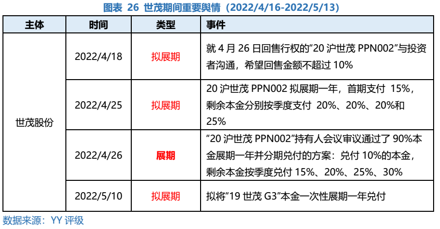 另一熱點主體世茂2022年一季度實現銷售簽約23億元,同比下降59%,后續經營性回款依舊十分艱難,在行業銷售尚未起色,疊加資產處置進展緩慢的情況下,面對巨大流動性壓力,世茂股份的境內私募債“20滬世茂PPN002”和“19世茂G3”最終走向展期。同時世茂擬將“19世茂G3”本金一次性展期一年兌付,該方案低于市場預期,也反映出行業仍處于低迷階段。受制于流程、市場行情等因素,不排除展期條款變得更差的情況,若銷售端持續低迷,二次違約情況也難以避免。