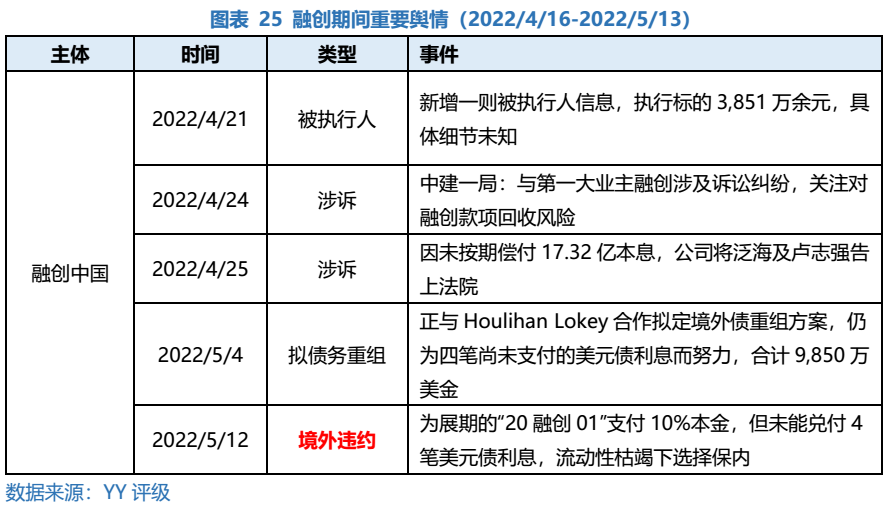 具體來看,熱點主體方面,融創一方面新增被執行人信息、訴訟糾紛等負面輿情,另一方面由于極度枯竭的流動性壓力,選擇“棄外保內”:遵循展期方案部分兌付境內展期債,而境外美元票據4筆利息違約,以避免觸發在岸銀行貸款更大規模的交叉違約,境內外表現出明顯的割裂感。這也是此輪地產暴雷潮中一個普遍的現象。公司將20融創01展期,寄希望于以時間換空間,但3-4月份公司重點布局的城市受疫情影響嚴重,銷售額大幅下滑65%左右,資金回籠難度也進一步加大。