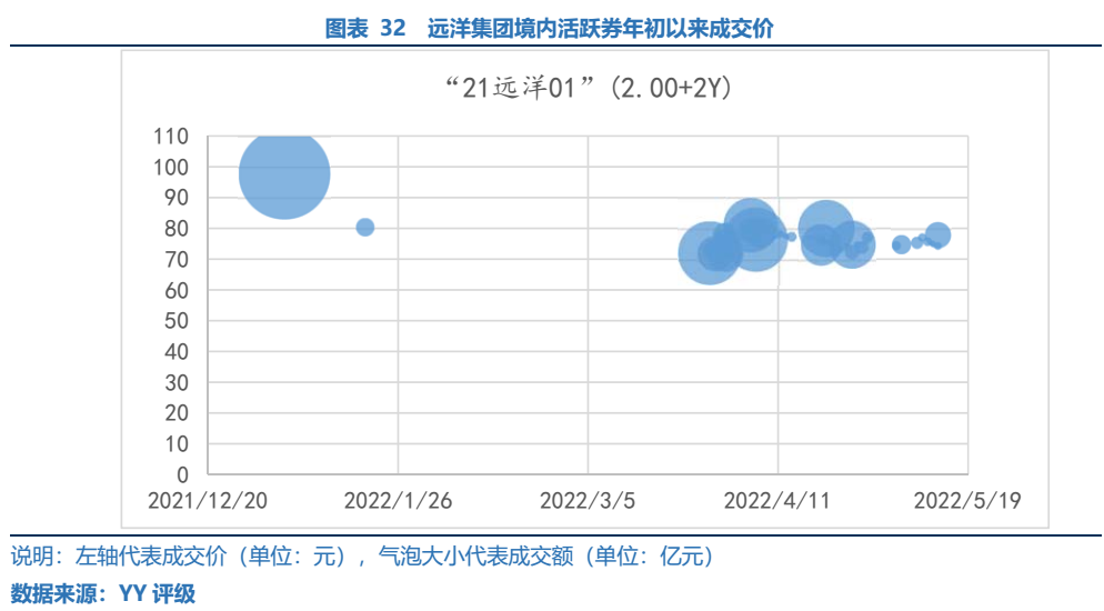 民企爆雷引發的市場負面情緒波及混改企業,遠洋集團的表外債務規模較大構成隱憂,而近期公募基金等機構出庫對公司存量債券估值造成了較大上行壓力,年初以來“21遠洋01”價格已由98元跌至70元檔位。