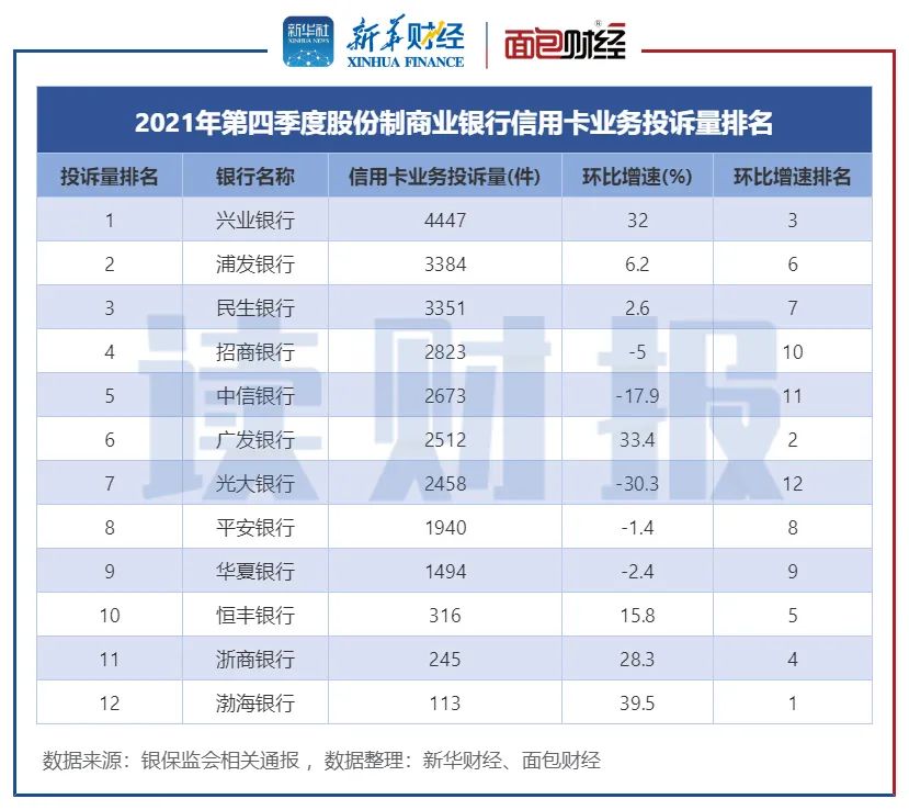 2021年全年,光大銀行、中信銀行、興業銀行分別位居銀行信用卡業務累計投訴量前三甲。