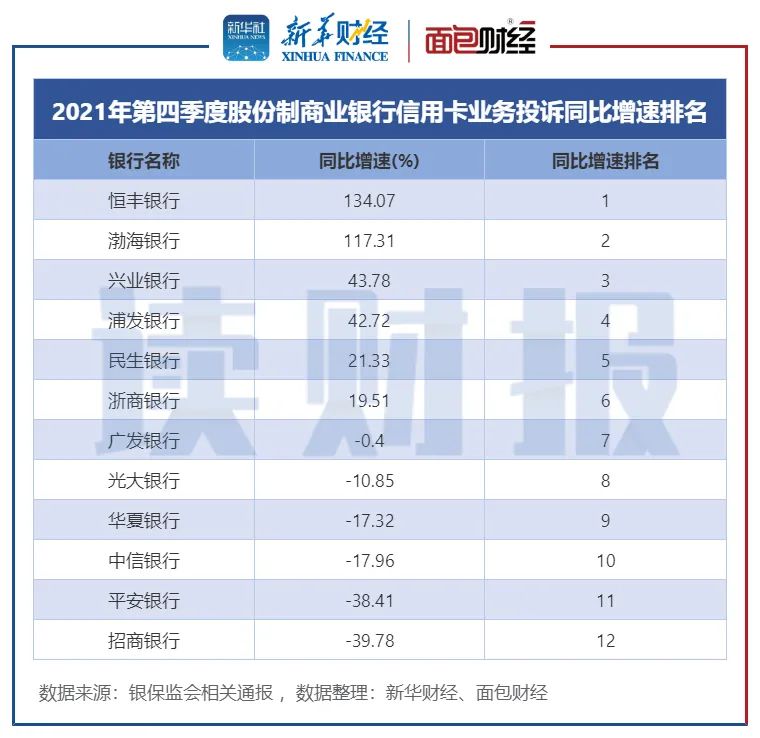 從2021年第四季度的同比增速來看,恒豐銀行和渤海銀行位居股份制銀行前兩位。但是,這主要是由于兩家銀行去年基數較低造成。即便在翻倍增長之后,2021年四季度兩家銀行的信用卡業務投訴量合計仍不超過500件。