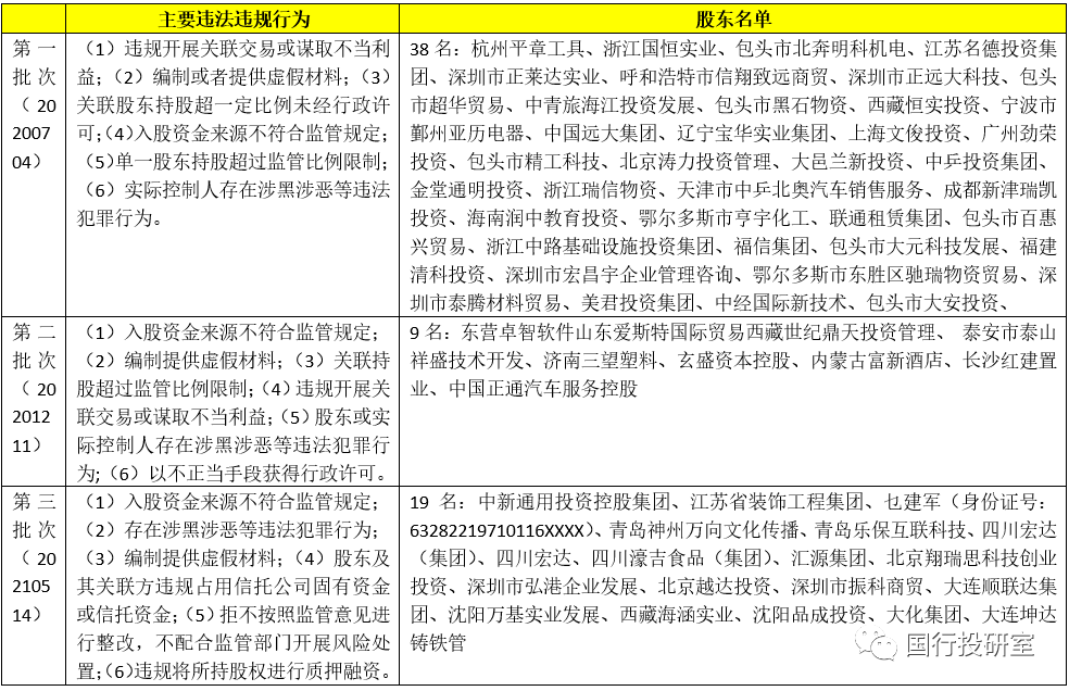 (2)2020年銀保監(jiān)會開展專項整治“回頭看”,覆蓋4600余家銀行保險機構,不僅首次開展了覆蓋全部商業(yè)銀行和保險公司的公司治理監(jiān)管評估以及銀行保險機構股權和關聯(lián)交易專項整治工作,還先后分三批次向社會公開了銀行保險機構重大違法違規(guī)股東(合計66家)。