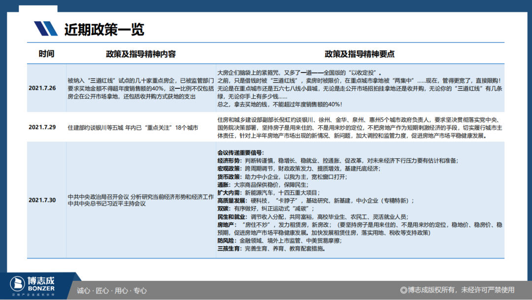 從2016年“房住不炒”總基調確定,到2019年以“穩地價、穩房價、穩預期”為目標,促進房地產市場平穩健康發展,再到2021年“十四五”規劃提出實施房地產市場平穩健康發展長效機制,促進房地產與實體經濟均衡發展,最后是今天的政治局會議上再次提出“穩地價、穩房價、穩預期”。近年來,國家已經從市場端、資金端、土地端對房地產行業進行了全方位的調控。