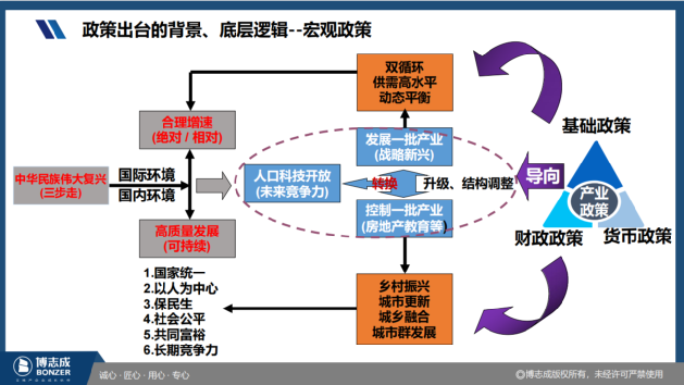 國際環境錯綜復盤,國內矛盾依然突出,近期政策明確釋放出控制一批(房地產、教育等)、發展一批(戰略新興)的產業結構調整與升級信號,人口科技開放的牽引政策,都國內大循環為主體、國內國際雙循環,促進產業結構優化、消費升級的手段。