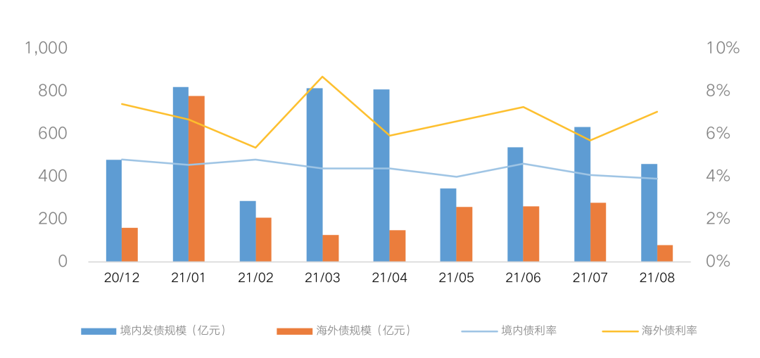 融資成本方面,資金面的總體寬松之下,8月房企境內發債利率保持平穩向下的趨勢。房企境內債券平均利率下探至3.9%,海外債方面,受部分房企高息發債影響,房企海外債平均發行利率回升至7.04%。
