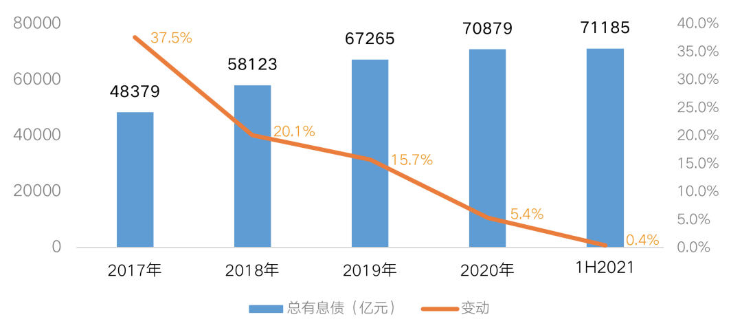 2021上半年末80家重點房企總有息債規模為71185億元,較期初增長0.4%,增速較于2020年的5.4%繼續下滑。房企的有息債增速在2017年到達高點后,隨著行業調控持續,并表債務增速持續下滑,特別是三條紅線以來,受限于降檔要求,以及政策對各檔企業有息債增幅的限制,房企強化債務增量控制,并維持“量入為出”的狀態。