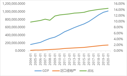 另外一個維度則是房地產+建筑業的泛房地產行業占比,這個口徑缺失了有關上下游拉動如鋼鐵、水泥、混凝土、建材、家居、家電等,但是建筑業的話也含基建,所以兩者一減一增,簡單作為房地產口徑的衡量指標,可以看出經濟體以鋼筋混凝土的房子作為衡量,整體2020年末占比接近14.52%,意味著整個房地產對于分配環節蛋糕的切分增幅巨大。
