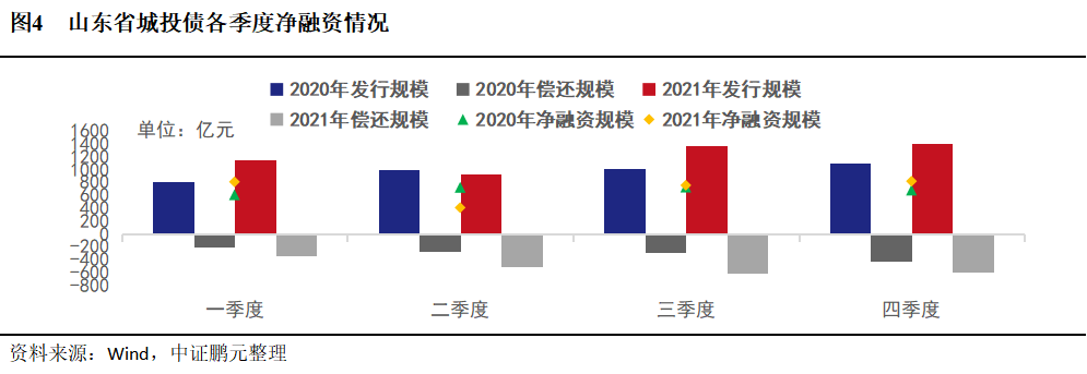 山東省2021年城投債發(fā)債總量保持增長,區(qū)域分化明顯。2021年山東城投發(fā)債規(guī)模和凈融資額均較2020年有所增加但增速放緩,同時季度波動明顯。