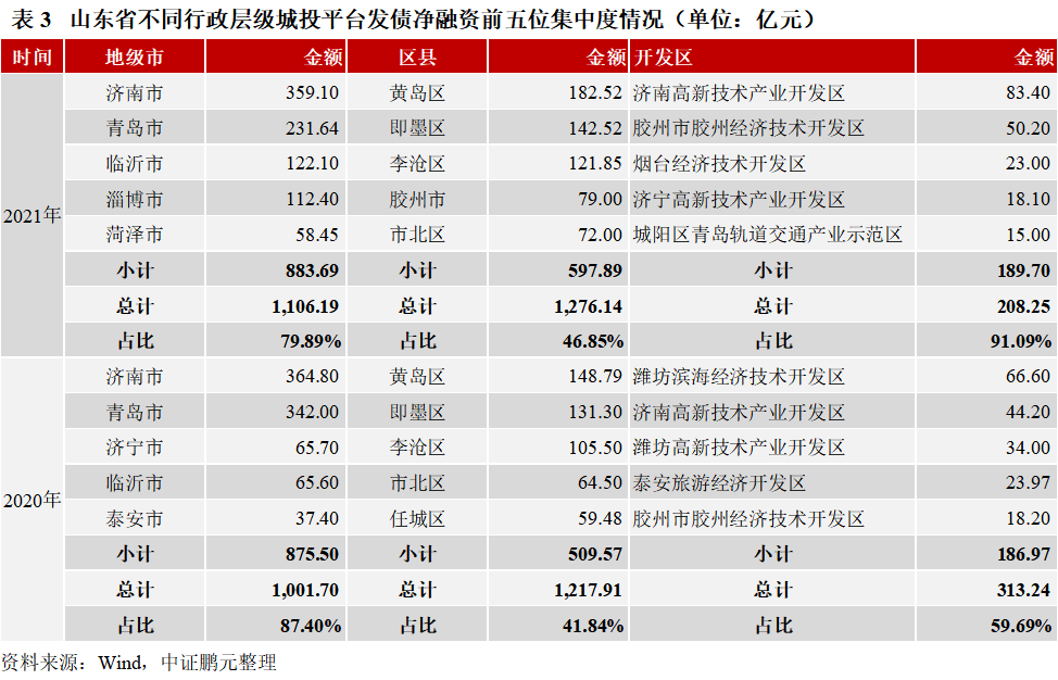 此外,從不同層級的凈融資集中度來看,與2020年相比,2021年區(qū)縣和開發(fā)區(qū)級別的城投主體前五位合計占比有所提升,地市級城投主體的凈融資前五位合計占比有所下降,集中度分化較大。