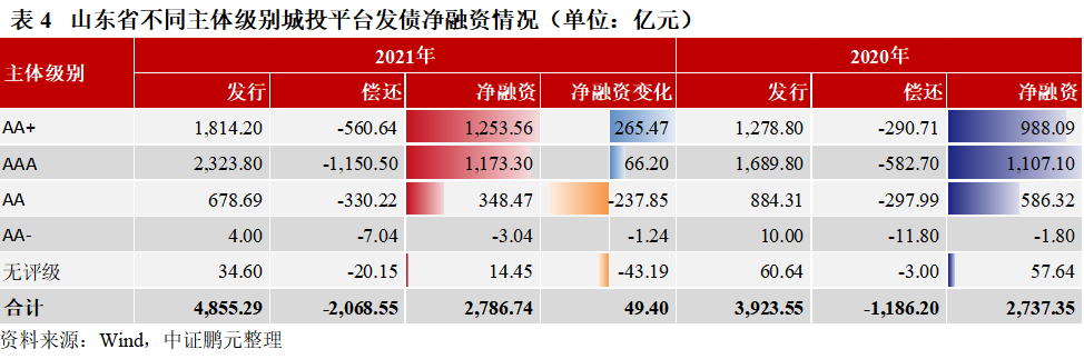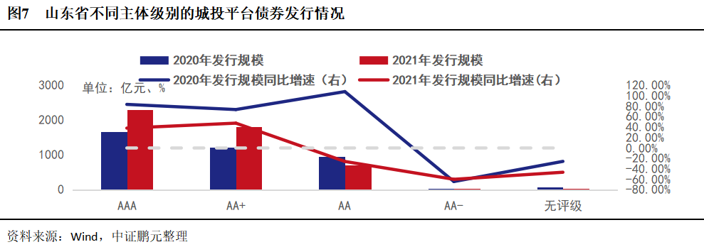 (2)高行政層級、高評級主體發(fā)行規(guī)模占比增加,弱資質(zhì)平臺增速下降明顯。2021年山東省高行政層級主體城投債發(fā)行規(guī)模占比增加且同比增速相對更高、增速放緩程度也更小,區(qū)縣主體發(fā)行增速大幅下滑。高級別主體城投債發(fā)行規(guī)模占比提升,同比增速表現(xiàn)更為穩(wěn)健,同時也是拉動凈融資增長的主要動力。