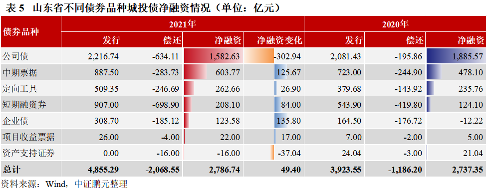 從不同債券品種凈融資來看,2021年山東省城投債凈融資仍主要由公司債貢獻(xiàn),但公司債凈融資規(guī)模同比出現(xiàn)收縮。此外企業(yè)債凈融資與上年相比由負(fù)轉(zhuǎn)正且增長較大,是2021年拉動凈融資增長的主要動力之一。