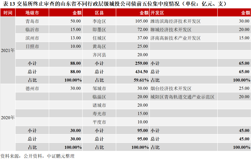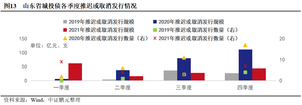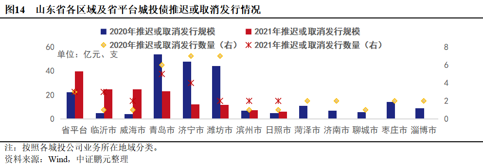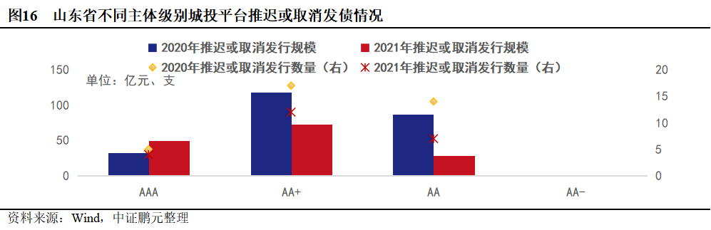 從不同行政層級主體來看,2021年山東省地級市和省級主體推遲或取消發(fā)行的城投債規(guī)模更大,但從數(shù)量上看區(qū)縣和地級市城投更多。