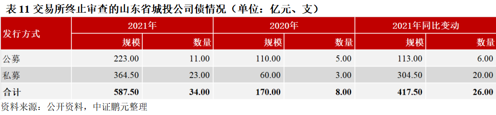 (5)交易所終止審查項目大幅增加,地區(qū)整體債務(wù)水平偏高區(qū)域推遲或取消發(fā)行債券更多。2021年山東省在交易所終止的公司債項目大幅增加,私募債受影響更大,青島和濰坊數(shù)量居前。推遲或取消發(fā)行的城投債數(shù)量和規(guī)模較上年均有下降,地區(qū)整體債務(wù)水平偏高區(qū)域多發(fā)。