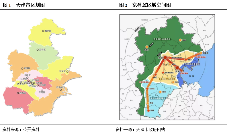 天津市位于環渤海經濟圈中心,在京津冀協同發展中承擔“一基地三區”的功能定位。天津市為四大直轄市之一,市中心距首都北京137公里,位于環渤海經濟圈中心,是我國北方最大的沿海開放城市、北方國際航運中心和國際物流中心,憑借優越的地理位置和交通條件,成為連接國內外、聯系南北方、溝通東西部的重要樞紐。2018年11月,中共中央、國務院要求推動京津冀協同發展,天津被賦予“一基地三區”的功能定位,即全國先進制造研發基地、北方國際航運核心區、金融創新運營示范區、改革開放先行區,積極承接北京非首都功能。