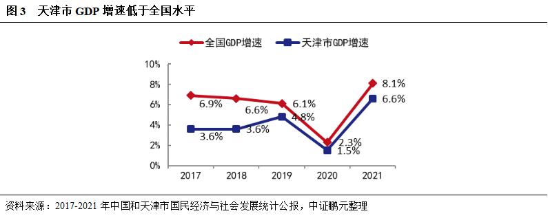 天津市經濟增長乏力,近年區域經濟增速均低于全國水平。天津以工立市,重工業發展帶動區域經濟崛起,依托港口優勢和工業發展,早期固定投資成為天津市經濟增長的重要推手,但高速投資持續性有限,且“三二一”產業結構轉型后區域消費、進出口對經濟增長驅動力不強,天津市經濟活力有所減弱。2017-2020年天津市GDP增速均低于全國水平,2021年全市出口額創近五年新高,帶動區域經濟增速提升,但仍不及全國水平。